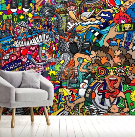 Wall covered in graffiti and wallpaper murals in the trendy area